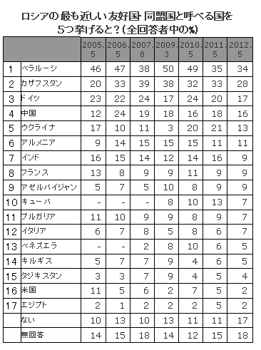 「友好国」では、共に関税同盟を構成するベラルーシ及びカザフスタンが上位に来ており、また、ロシアの主要な貿易相手国である中国やドイツの順位も高い。「非友好国」では、ロシアと安全保障上の課題を抱えるグルジアや米国が上位であるほか、バルト3国の印象もよくないことが分かる。日本の好感度は、2010年11月のメドベージェフ前大統領の国後島訪問などにより関係が悪化した前回調査時からは、多少改善された模様。